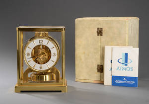 Jaeger-Le-Coultre. Bordur model Atmos, i kasse af messing og glas mærket ?Atmos Jaeger-Le-Coultre?, hvid timekrans med forgyldte timeangivelser. Transport sikring samt regulatorskruer. Nr. 100599. H. 22. B. 18. D. 13 cm. Original transportkasse og brugsanvisning medfølger. Historik: Atmos uret bliver fremstillet i et begrænset antal årligt. Der findes forskellige udgaver af Atmos typen, men fælles for alle er den høje kvalitet samt det mekaniske urværk, der drives ved hjælp af atmosfærens tryk. Ved Atmos-uret (atmosfærisk ur) udvindes energi til optrækning ved udvidelse og sammentrækning af en ?barometerdåse?. 2K (2 Kelvin) temperatur forskel i omgivelsen er tilstrækkelig indenfor 48 timer til at uret igen er trukket op. Da den opnåelige energi er så lav anvendes et torsionspendul. Uret er patenteret.