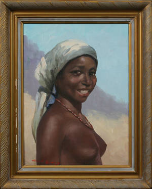 Ubekendt kunstner. Afrikansk kvinde. Olie på lærred. Sign. 40 x 30 cm (51 x 41). Erhvervet af nuværende ejers forældre i 1960'erne.