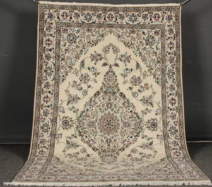 Signeret fintknyttet persisk Nain Akhavan , ægte håndknyttet tæppe vævet af uld med reliefmønstre af silke på grundvæv af bomuld, rigt dekoreret med florale mønstre, cremefarvet bund med florale mønstre i blålige nuancer. 206 x 127 cm.Dette tæppe stammer fra byen Nain i nærheden af ??Isfahan i det centrale Persien. Nain tæpper er som regel meget lyse med en creme-farvet eller dybblå basisfarve og en stor medaljon i midten. Tæppet fremstår med skiftende farvenuance, alt efter lysindfald pga silken samt den fine uldkvalitet.