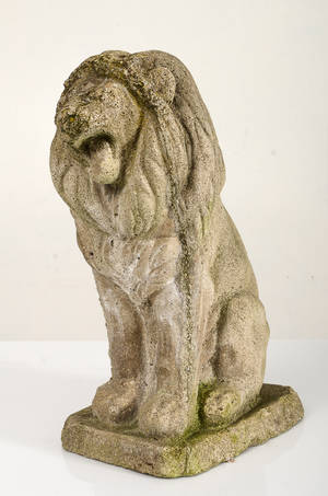 Skulptur i sandsten i form av lejon. Slitage. H: 48 cm.
