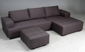 Dansk design. Stor sofa bestående af tre moduler, med chaiselong samt puf. HØJREVENDT Stående på mørke træben. Komposition: Fast sæde med 35kg 160 neuton på nozagfjedre, hynder med granulat og fibervat. Polstret med kraftigt møbelstof i farven "antrazit". Mål: H. 82 B. 285 D. 84-150 cm. Chaiselong B. 105 D. 150 cm. Puf H. 40 B. 75 D. 70 cm. Siddehøjden er 40 cm. Fremstillet i EU. Leveres i original emballage, 2 colli.