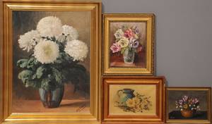 Samling blomsteropstillinger, 1900-tallet. Olie på lærred, sign. Mål på største til sammenligning, 63 x 47 (74 x 58) cm. (4)
