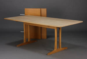 Børge Mogensen. Shakerbord af massivt bøgetræ med to tillægsplader af lakeret bøgetræ, H. 73 cm. L. 180 + 2 x 47 cm. B. 91 cm. Läs mer...