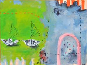 Lisbeth Aare født 1959. Akryl på lærred.'Regatta', signeret og beskrevet bagpå, 60 x 80 cm. Lisbeth Aare er uddannet fra Designskolen i Kolding. I dag fuldtidskunstner i Strib ved Middelfart. Hun arbejder bl.a. meget figurativt med en forkærlighed for særprægede situationer og personer.