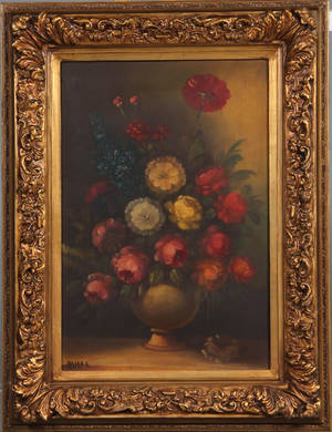 Ubekendt kunstner. Blomsteropstilling. Olie på lærred. 88 x 58 ( 120 x 92 ) cm. Signeret MHAS. Monteret i pragtramme.
