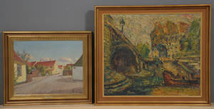 Einar Johansen og Th. Ulrichsen: Paris og Dragør-motiver. Olie på lærred. Sign. Th. Ulrichsen og EJ. Ene med røgbelægning. 40 x 50 cm. (53 x 63 cm.) og 60 x 70 cm. (72 x 82 cm.) (2)