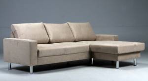Dansk design. Sofa bestående af to moduler, med vendbar chaiselong. Kan vendes ved at skrue armlæn af og montere delene modsat. Stående på forkromet metalben. Komposition: Fast sæde med 35kg 160 neuton på nozakfjedre, Hynder med granulat og fibervat. Polstret med beige møbelstof. L. 225 cm, H. 82cm, D. 82/155 cm. Fremstillet i EU. Leveres samlet.