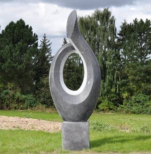 Skulptur af sort, delvist upoleret marmor. Signeret på sokkel Jørgen Mernild. Mål ca. H. 152 cm. B.54 x D.30 cm. Vægt anslået ca. 200 kg.