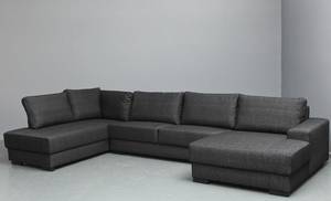 Dansk design. Stor sofa bestående af tre moduler, med chaiselong i to dybder. Stående på sorte træben. Komposition: Fast sæde med 35kg 160 neuton på nozakfjedre, hynder med granulat og fibervat. Polstret med kraftigt møbelstof i sort nistret farve. L. 365 cm, H. 82cm, D. 85/190-110/145cm. Fremstillet i EU. Leveres i , 3 colli.