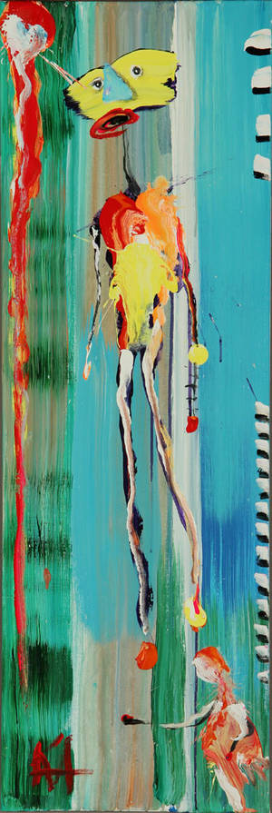 Kjeld Appel født 1960. 'Komposition med figur'. Akryl på lærred. Sign. monogram KA. Uindrammet 120 x 40 cm.
