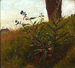 Ludvig Kabell: Vilde blomster på en bakke. Sign. L. K. Olie på lærred. 20 x 21.