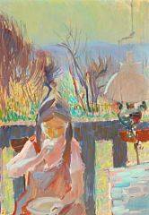 Poul S. Nielsen: Portræt af spisende pige på veranda med udsigt. Sign. monogram PN 68. Olie på lærred. 100 x 70.