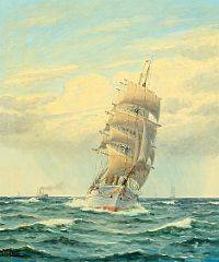 Marine med fuldrigger gående agten for tværs på styrbord halse. Sign. Fr. Landt. Olie på lærred. 56 x 48.