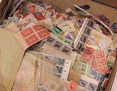 Rodekasse. Gammel æske med masser af løse mærker, poser m.m. Imellem er en del Berlin-overtryk
