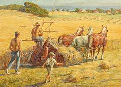 Høst med selvbinder. Sign. C. Budtz-Møller 1948. Olie på lærred. 67 x 94.