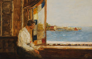 Axel Johansen. Dame der kigger ud over havet, olie på lærred, sign. A J, 27 x 42,5 cm.