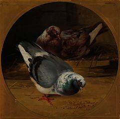 Ubekendt maler, 19. årh.: Duer. Sign. A. H. Olie på lærred. 43 x 43.