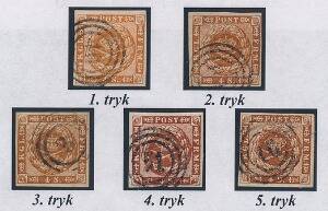 1858. 4 sk. brun. Tryk 1-5. Komplet trykopstilling...
