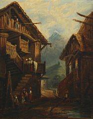 Ubekendt maler, 19. årh.: Parti fra en bjerglandsby med personer mellem huse. Utydelig signatur. Olie på malepap. 25 x 20.