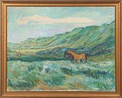 Axel P. Jensen: Landskab med heste. Sign. Axel P.J. 24. Olie på lærred. 105 x 127.