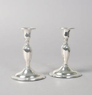 To par lysestager af sølv, begge med runde profilerede fodstykker, prydet med rosetter. Udfyldte. Det ene par udført hos Cito, Fredericia, det andet stemplet hhv. Läs mer...