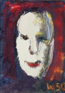 Portræt, olie på pap, portræt med hvid glorie, Wiliam Skotte Olsen, 1945-2005, sign. monogram WSO, 13x25 cm (16,5x28) Fremstår med farvebortfald langs kant, samt huller Läs mer...
