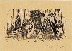 Asger Jorn: "Begräbnis", 1935. Sign. Asger Jørgensen. Linoleumssnit. Lysmål 10,5 x 15,5