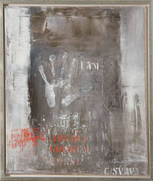 Carsten Svava. Acryl på lærred. Komposition med hånd og bogstaver. Signeret C. Svava. H: 60, B: 50 cm. Indrammet 64 x 54 cm