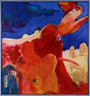 A. Højer. Maleri, akryl på lærred, abstrakt komposition. 92,5 x 86 (96 x 90) cm.