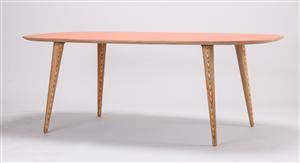 Snedkermester Lau Lauritsen. Spisebord med koniske ben af olieret birk, ellipseformet plade med orange højtrykslaminat, underside med sort højtrykslaminat. Fremstillet af Snedkermester Lau Lauritsen, brænd-stempel herfra under bordpladen. H. 73 L. 200 B. 110 cm. NB. leveres usamlet