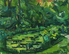 Avslutade auktioner liknande Ubekendt kunstner, 20. årh.: Parkparti med dam og fodgænger. Utydeligt signeret, 56. Olie på lærred. 53 x 68.