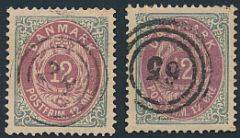 1875. 12 øre, 10.tryk, pos.26 og pos. 69, begge med LILLE PERLEFEJL. AFA: 1800