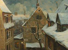 Alfred Broge: Skumringsparti med sneklædte tage. Sign. Alf. Broge. Olie på lærred. 41 x 54.