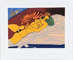 Kvinde og tiger, 1987. Sign., dateret og nummereret, 156/200. Litografi i farver. Bladstørrelse 60 x 78.
