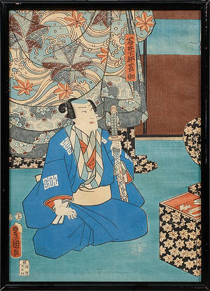 Utagawa Kunisada och Toyohara Kunichika (1835–1900), träsnitt ur serien Seichū gishi den Ichikawa Kuzō III i rollen som Kurahashi Densuke Takeyuki ur serien Kabuki actors Läs mer...