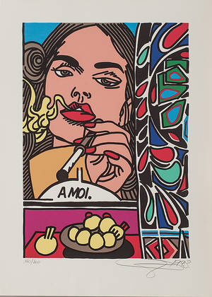 Erró, "La femme fatale II" Färgserigrafi, 1993, signerad HC. 117,5 × 75 cm. Ej examinerad ur ram. Läs mer...