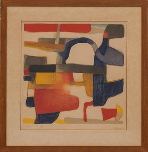 Maurice Estève, "Jour de fête". Färglitografi, 1952, signerad XLVII/LX. P. 44 x 32 cm. Ej examinerad ur ram, missfärgad, blekt. Läs mer...