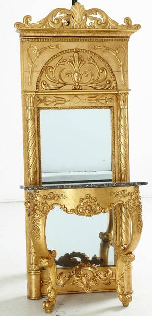 Förgylld och bronserad spegel med skuren dekor samt dekor av pastellage. Höjd 156, bredd 54 cm. Bronserat konsolbord med skuren dekor. Löst liggande stenskiva. Konsolbordets Läs mer...