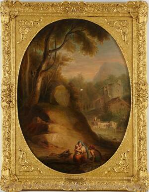 AUGUSTE HERVIEU (1794-1858): Landskap med figurer, signerad Auguste Hervieu, olja på duk, ca 77 x 57 cm. Dukskada.