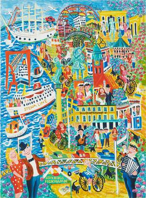 GUNILLA MANN (född 1947): "Hamnstaden Göteborg", signerad Gunilla Mann, E. A., färglitografi, bladmått ca 63,5x90,5 cm, oramad. Oramad, ett hörn med veck.
