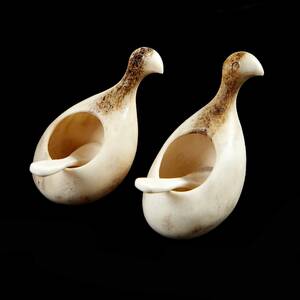 SALTRIPOR med skedar, 1 par, horn, signerade och daterade Lars Pirak, Jokkmokk, 86? , höjd ca 6 cm. 293171.