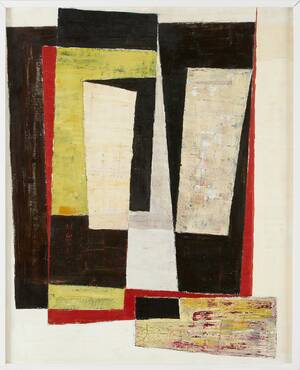 CHAMBERT, Erik (1902-1988): Komposition, signerad a tergo ERIK CHAMBERT, etikett a tergo "Chae-14 251, 299, Åmells", olja på pannå, ca 99x80 cm. Smärre krackeleringar.