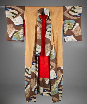 Japansk kimono af silke, motiver i form af blomster og bladværk. Japan medio 1900-tallet. L. ca. 110 cm. Fremstår med brugsspor og små pletter. Läs mer...