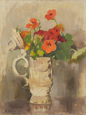 KJERNER, Ester (1873-1952): Krasse i vit kanna, signerad och daterad E.Kjerner 1944, olja på duk uppklistrad på pannå, 37x28 cm. Färgbortfall längs kanterna, slitage.
