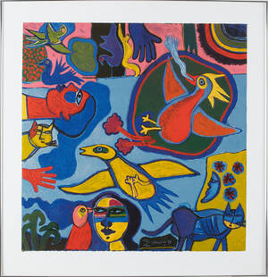 Corneille (1922-2010), Belgien. Signerad, numrerad 90/200, daterad -90, kvinna & fågel. Färglitografi, bildmått: 24x32 cm, yttermått inklusive ram: 50x56 cm. Corneile van Beverloo, Corneille, född Läs mer...