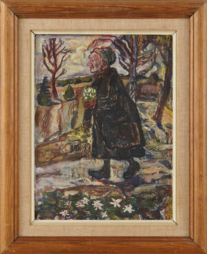 Olle Nordberg (1905-1986), Sverige. Två Tanter. Signerad. Olja på pannå 26x15 cm, yttermått inklusive ram: 41x30 cm. Olle Nordberg, född 1905, död 1986, svensk målare. Läs mer...