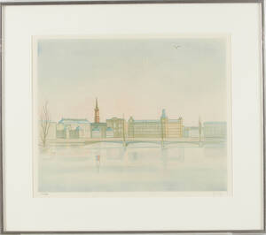 Einar Jolin (1890-1976), Sverige. Utsikt mot Riddarholmen. Signerad, numrerad 305/360. Färglitografi, bildmått: 47x56 cm, yttermått inklusive ram: 71x80 cm. Einar Jolin, född 1890 i Stockholm, Läs mer...