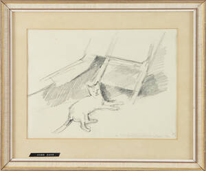 ZUHR, Hugo (1895-1971): Katt, blyerts på papper, mongramsignerad med dedikation, 27x37 cm. Något gulnad.