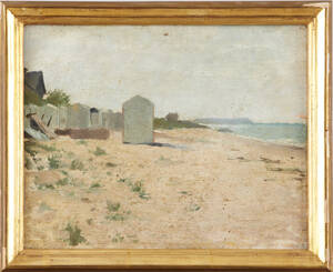 OIDENTIFIERAD KONSTNÄR (18/1900-tal): "Plage Normandie", fransk skola, olja på pannå, ca 21,5x27 cm. Fläckar, smärre färgbortfall.
