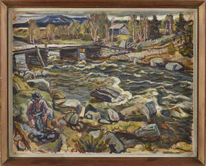 NORDBERG, Olle (1905-1986): Landskap med fors, signerad Olle Nordberg 41, olja på pannå, ca 61x78 cm. Obetydliga pannå skador.